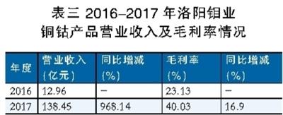 2017年,得益于鈷產(chǎn)量的大幅提升(見表二)及其價(jià)格高企,鈷產(chǎn)品成為了洛陽鉬業(yè)的主要收入來源。2017 年,洛陽鉬業(yè)實(shí)現(xiàn)營業(yè)務(wù)收入 241.48億元元,同比增長247.47%,其中,銅鈷相關(guān)產(chǎn)品的營業(yè)收入達(dá)138.45億元,占57.33%,同比增加38.69個(gè)百分點(diǎn);主營業(yè)務(wù)實(shí)現(xiàn)毛利潤89.05億元,其中,銅鈷產(chǎn)品的毛利潤達(dá)55.42億元,占62.23%(見表三);實(shí)現(xiàn)歸屬上市公司股東的凈利潤為27.28億元,同比增長173.32%。由此可見,鈷產(chǎn)品已經(jīng)成為洛陽鉬業(yè)的主要收入和利潤來源,其對(duì)洛陽鉬業(yè)的營業(yè)收入和利潤都有重大的影響。