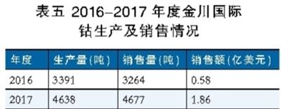 根據(jù)業(yè)績快報(bào),2017年,金川國際業(yè)績大幅增長。2017年其營業(yè)收入為5.49億美元,比2016年的3.65億美元增長了50.5%;其中,礦資源收入達(dá)4.49億美元,同比增長71%;而其中鈷的收入增長最多,達(dá)221%。這主要是其銷售量和銷售價(jià)格大增所致(見表五)。
