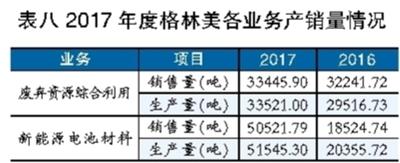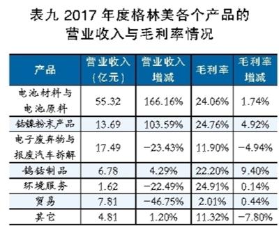 2017年度,格林美鈷相關(guān)產(chǎn)品的產(chǎn)銷量大增 (見表八),因此,其業(yè)績也十分亮眼。其實(shí)現(xiàn)營業(yè)收入107.52億元,增長37.22%;利潤總額7.95億元,增長123.47%;歸屬于上市公司股東凈利潤6.1億元,增長131.42%。其中,電池材料與電池原料業(yè)務(wù)板塊(主要是硫酸鎳、硫酸鈷、四氧化三鈷、三元前驅(qū)體、三元正極材料、鈷酸鋰等)實(shí)現(xiàn)營業(yè)收入為55.32億元,增長166.16%,貢獻(xiàn)毛利額13.31億元(見表九);鈷鎳鎢粉末與硬質(zhì)合金產(chǎn)品業(yè)務(wù)板塊實(shí)現(xiàn)營業(yè)收入20.48億元,增長54.76%,貢獻(xiàn)毛利額4.9億元;可見,鈷相關(guān)產(chǎn)品回收與再利用已經(jīng)是格林美營收和利潤的主要來源。