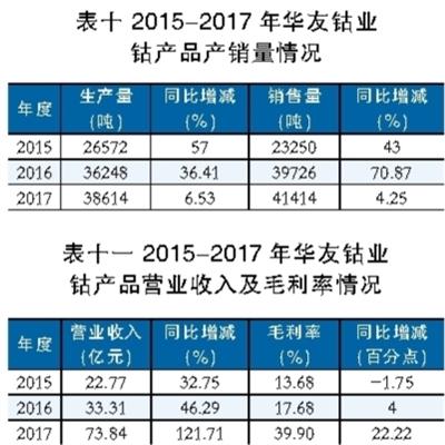 華友鈷業(yè)是我國鈷產(chǎn)品生產(chǎn)龍頭之一,其2017年鈷產(chǎn)品銷量超過40000噸(金屬量20663噸)約占國內(nèi)消費(fèi)量的35%,占全球消費(fèi)量的18%(見表十)。據(jù)財(cái)報(bào),2017年華友鈷業(yè)實(shí)現(xiàn)營業(yè)收入96.53億元,增長97.43%,其中,鈷產(chǎn)品實(shí)現(xiàn)收入73.84億元,增長121.71%(見表十一);實(shí)現(xiàn)凈利潤18.86億元,增長3145.19%;歸屬于母公司所有者凈利潤為18.96億元,增長2637.70%,業(yè)績十分驚人。