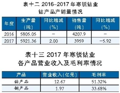鈷產(chǎn)品在寒銳鈷業(yè)的收入構(gòu)成中占比越來越重(見圖二),再綜合其產(chǎn)品毛利率來看(見表十三),鈷產(chǎn)品是其收入和利潤的核心來源。故而,寒銳鈷業(yè)也在加碼鈷產(chǎn)品產(chǎn)能。2017年,其年產(chǎn)3000噸金屬量鈷粉生產(chǎn)線和技術(shù)中心建設(shè)項(xiàng)目按計(jì)劃順利推進(jìn),剛果邁特礦業(yè)有限公司建設(shè)年產(chǎn)5000噸電解鈷生產(chǎn)線項(xiàng)目,已完成前端5000噸金屬量氫氧化鈷生產(chǎn)線,并已經(jīng)投產(chǎn)發(fā)揮效益;寒銳鈷業(yè)在科盧韋齊投資建設(shè)2萬噸電積銅和5000噸氫氧化鈷項(xiàng)目也按計(jì)劃推進(jìn)中。這些項(xiàng)目完成后,其鈷產(chǎn)能將大幅增加。