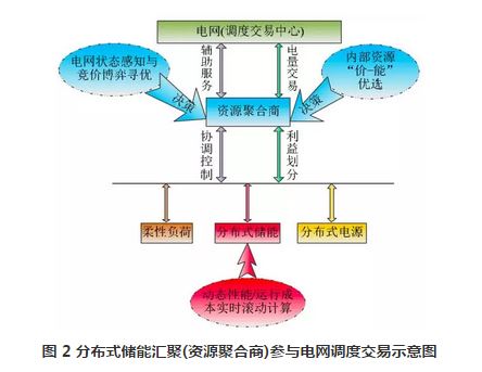 總體而言,已有研究大多針對集中式大容量的儲能系統(tǒng),而對于分布式儲能參與電網輔助服務的協(xié)同控制技術研究還較少。如何構建規(guī)?;植际絻δ軈R聚效應的動態(tài)仿真模型,協(xié)調控制多點布局的分布式儲能以及柔性負荷,亟需開展相關內容的深入研究與應用。有研究定義了負荷聚合商概念,因此進一步可以擴展到儲能參與需求響應和提供輔助服務中,將會出現“資源聚合商”,未來資源聚合商將匯聚若干分布式用戶儲能參與電力市場交易,基本框架如圖 2 所示。