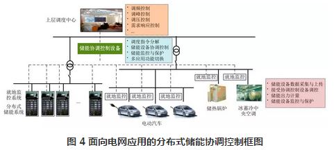 目前,國際上的分布式儲能協(xié)調控制設備研發(fā)也處在剛剛起步的過程,如德國能源供應公司SENEC.IES,目前有 2000 個用戶參與到他們的Economic Grid計劃中,家庭用戶安裝“雙向能源管理系統(tǒng)”(簡稱 BEMI),每 15 min 儲存用戶用電數據,記錄用戶用電習慣,當電價發(fā)生變動時,BEMI 通過控制分布式儲能系統(tǒng)來調控用電時間和用電量。目前國內尚沒有分布式儲能相關產品,主要是借用微網控制器實現類似功能,然而微網控制器多用于本地控制,很少涉及到廣域多點調度相關功能,同時微網控制器缺乏對電池儲能系統(tǒng)在線檢測、充放電優(yōu)化控制和保護的相關功能,難以實現對于分布式儲能系統(tǒng)的全面控制和優(yōu)化。伴隨配網側分布式儲能的快速發(fā)展,面向電網的儲能資源匯聚應用將包含電池儲能設備、通過 V2G并網的電動汽車、儲熱鍋爐、冰蓄冷中央空調等分布式儲能設備,通過多設備間的協(xié)調控制,參與電網調峰、調頻等應用,如圖4所示。在這個過程中,儲能系統(tǒng)的協(xié)調控制設備在上層調度和各分散的分布式儲能資源間起到調度指令分解、儲能設備協(xié)調控制、儲能監(jiān)控與保護、多應用功能切換等功能。