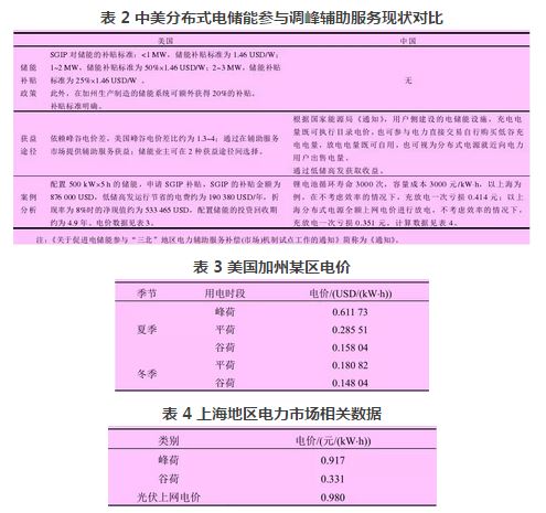 對分布式儲能的經濟評價,需要量化儲能的投資運行費用、政策的補貼、工作模式如削峰填谷和配合新能源接入等帶來的收益以及節(jié)能減排等其它收益。由于新能源出力的不確定性,可以使用典型日提取、信息決策理論等方法對儲能帶來的收益進行量化評估,建立相應的目標函數,評估儲能投資的可行性。分布式儲能參與系統(tǒng)調峰目前在美國已經實現商業(yè)化運營,針對這一應用模式就目前中美兩國的應用現狀進行比較,如表 2 所示。