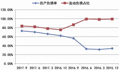 圖五 2015年12月以來堅瑞沃能各季度資產(chǎn)負債率和流動負債占比情況