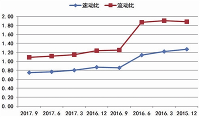 圖六 2015年12月以來堅瑞沃能各季度流動比、速動比情況