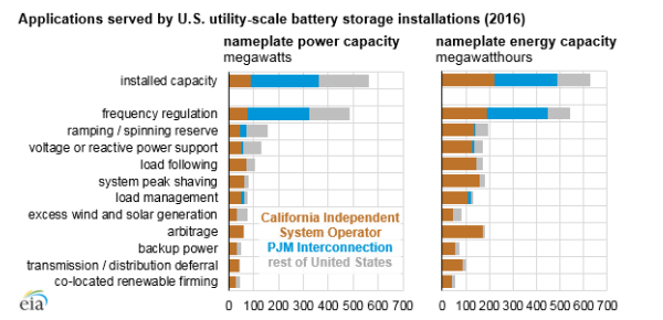 中國儲能網(wǎng)訊:2016年美國的公用事業(yè)規(guī)模電池存儲容量的三分之二位于兩個(gè)電力市場:覆蓋加利福尼亞州大部分地區(qū)的加利福尼亞州獨(dú)立系統(tǒng)運(yùn)營商(CAISO),以及覆蓋美國東部13個(gè)州的全部或部分地區(qū)和哥倫比亞特區(qū)的PJM公司。公用事業(yè)規(guī)模的電池系統(tǒng)由于不同的原因安裝在這兩個(gè)市場。加利福尼亞州的公用事業(yè)規(guī)模電池存儲系統(tǒng)傾向于服務(wù)于能源導(dǎo)向型應(yīng)用,其功率較小,但放電持續(xù)時(shí)間長。與之相反,PJM中的系統(tǒng)傾向于服務(wù)于功率為導(dǎo)向的的應(yīng)用,功率更大,但放電持續(xù)時(shí)間短。