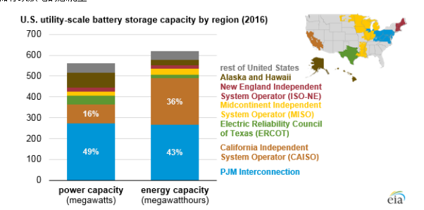 美國公用事業(yè)規(guī)模蓄電池儲能容量的地區(qū)分布