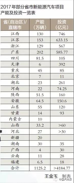記者對2017 年媒體報道過的新能源汽車投資項目進行梳理后發(fā)現(詳見“2017 年部分省市新能源汽車項目產能及投資一覽表”),僅2017 年發(fā)布的全國各地的規(guī)劃產能就接近1200 萬輛,涉及投資4000 多億元,而這些規(guī)劃都是以2020 年為節(jié)點完成投產。再加上此前已經得到國家發(fā)改委等有關部門審批的項目、既有的汽車制造企業(yè),新能源汽車的產能已經遠遠超過了這個數字。甚至有專家稱,僅山東省就有40多家企業(yè)在制造新能源汽車。