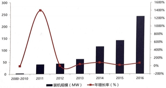 截至 2016 年我國(guó)電化學(xué)儲(chǔ)能累計(jì)裝機(jī)規(guī)模 243MW