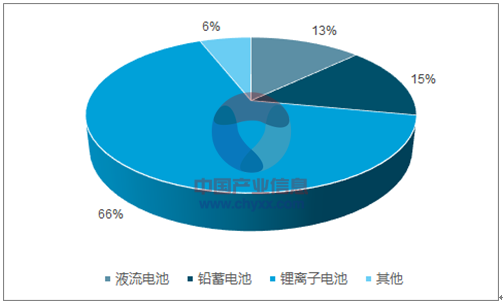 從應(yīng)用技術(shù)類型來(lái)看,截至 2015 年底的儲(chǔ)能項(xiàng)目統(tǒng)計(jì)情況,鋰離子電池是最為常用的技術(shù)類型,約 占所有項(xiàng)目的 66%,其次是鉛蓄電池(鉛炭),約占 15%,液流電池占 13%。2016 年中國(guó)新增投運(yùn) 的電化學(xué)儲(chǔ)能項(xiàng)目幾乎全部使用鋰離子電池和鉛蓄電池,兩類技術(shù)的新增裝機(jī)占比分別為 62%和 37%。