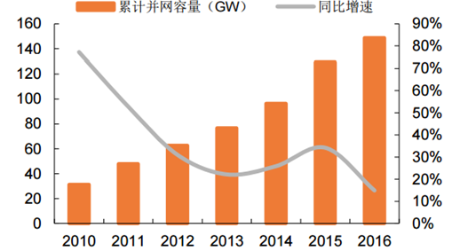 截至 2016 年國(guó)內(nèi)累計(jì)風(fēng)電裝機(jī)規(guī)模 148.6GW