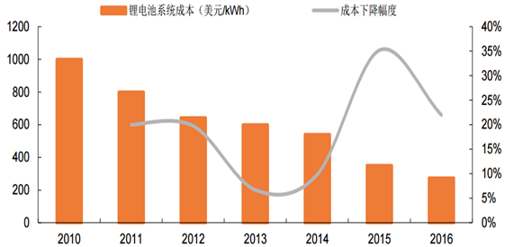 鋰電儲(chǔ)能電池系統(tǒng)平均成本快速下降