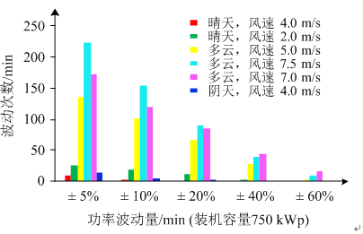 從圖2的統(tǒng)計結(jié)果看出:功率波動幅值主要集中在光伏裝機容量的±5%~±40%范圍內(nèi),超過±60%范圍的功率波動次數(shù)較少;多云天氣下,功率波動更頻繁,主要是由于云移動過程中頻繁地遮擋太陽造成;晴天和陰天下功率波動次數(shù)很少,幅值也很低,主要因為晴天云少,對太陽的遮擋較少,而陰天光伏本身出力就低,使得功率的可波動范圍相應(yīng)地被縮小。