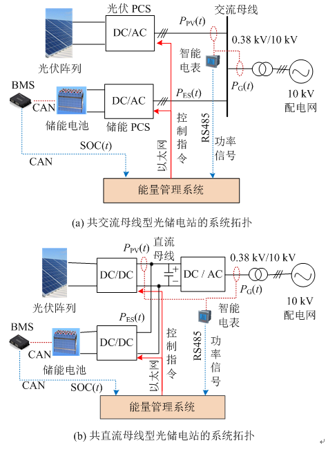 目前,光儲型電站的典型拓撲結(jié)構(gòu)主要有2種:共交流母線型和共直流母線型。基于這2種拓撲結(jié)構(gòu),本文建立的用于平抑光伏并網(wǎng)功率波動的控制系統(tǒng)拓撲如圖4所示。