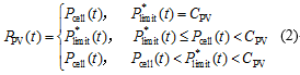 1)將ΔP(t)作為限功率算法的輸入?yún)?shù);然后,該算法再根據(jù)電網(wǎng)規(guī)定的光伏并網(wǎng)功率允許波動值Pglimit和儲能PCS的最大輸出功率PES,max對光伏PCS的MPPT工作點作出調(diào)整,得到光伏MPPT的功率上限參考值P* limit (取值為0.1CPV~CPV,CPV為光伏的裝機容量/kWp)。Pcell為光伏電池當前最大可輸出功率,為了滿足平抑功率波動的需要,光伏PCS的輸出功率PPV滿足如下: