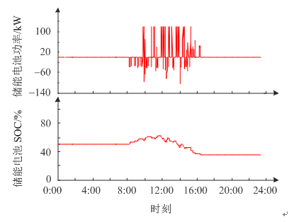 儲能電池的充放電功率曲線和對應(yīng)的SOC變化曲線如圖8所示。從仿真結(jié)果可以看出,本文所提策略能夠控制儲能電池工作在“淺充淺放”狀態(tài)下,儲能電池的SOC在50%附近波動。其次,儲能PCS的充放電功率始終在[-120, 120]kW的安全約束范圍內(nèi),證明了本文所提的儲能控制策略的正確性。