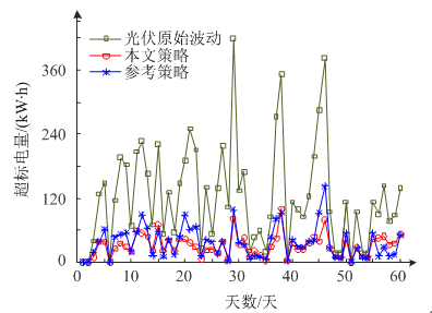 計算得出光伏原始功率超標電量、經(jīng)本文策略以及經(jīng)參考策略平抑后的超標電量的平均值分別為:123.27 kW?h/天、31.67 kW?h/天、37.39 kW?h/天。從超標電量的均值來看,本文所提策略和參考策略都能有效地平抑光伏功率波動,但本文策略超標電量的平均值更小,平抑效果更好。