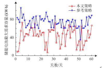 2種策略Eneed的分布情況如圖11所示,從仿真結(jié)果可以直觀地看出本文所提策略對儲能的容量需求遠小于參考策略。
