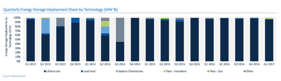 根據(jù)發(fā)布的數(shù)據(jù)顯示,鋰離子電池仍占據(jù)儲能市場的主流地位,占2017年1季度儲能市場的96.5%,在用戶側(cè)儲能市場亦是占據(jù)主導地位。