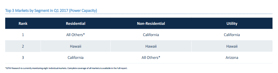在2017年1季度,用戶側(cè)儲能安裝較2016年4季度降低了21%。同時,住宅用儲能市場發(fā)展相對平緩,環(huán)比降低了1%。相比之下,非住宅用儲能市場降低了24%,導致大幅下滑的主要原因是萬眾期待的下一階段的自發(fā)電激勵計劃(Self-Generation Incentive Program)在很大程度上造成了加州非住宅用儲能市場的急劇下降。