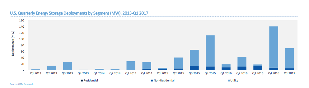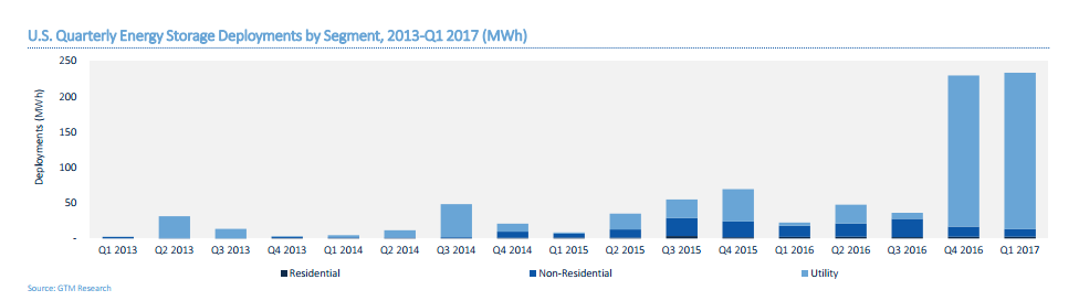 2017年1季度,美國儲能安裝達到233.7MWh,環(huán)比增長2%,同比增長944%,創(chuàng)下美國歷年來季度安裝量之最。