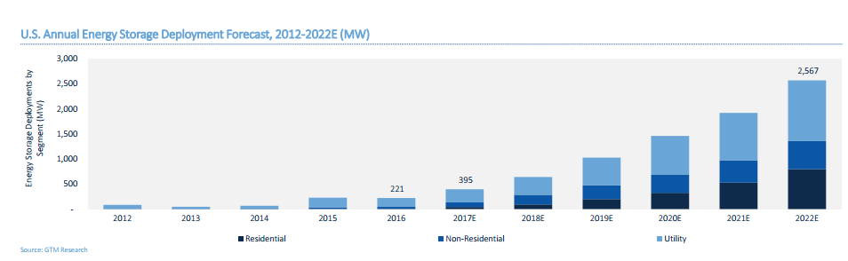GTM研究所預測,2022年美國儲能市場將增長到2.6GW左右,幾乎是2016年的12倍(221MW)。