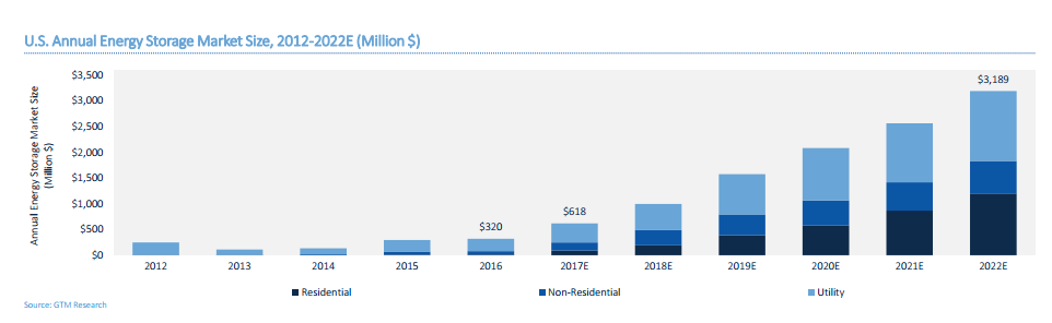 2017年,美國儲能市場收益增長幾乎是2016年的2倍。其中,住宅用儲能市場收益激增650%,公共事業(yè)單位的儲能市場收益增長將是歷年來最高,達到1.28億美元。
