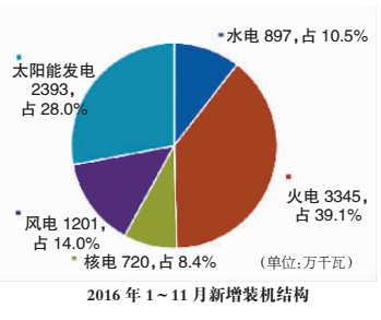 受煤電政策、環(huán)境約束等因素影響,2016年1~11月,全國新增裝機規(guī)模同比下降了5.4%,為8557萬千瓦。其中,火電新增裝機同比下降了30%,非化石能源新增裝機同比增長21%,比重進一步提升至60.9%,創(chuàng)下歷史新高。預(yù)計全年新增裝機規(guī)模將達到1.3億千瓦,同比下降1.7%。其中,非化石能源新增裝機比重為61.1%。期末總裝機容量達到16.5億千瓦,同比增長8.5%,非化石能源裝機比重達到36.2%,較2015年提高了2.1個百分點。