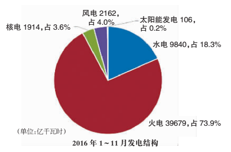受電力需求回暖的帶動,2016年1~11月,全國發(fā)電量約5.4萬億千瓦時,同比增長4.2%,增速較2015年同期提高了4.1個百分點。其中,火電發(fā)電量同比增長2.2%,增速同比提高4.6個百分點。風(fēng)電、核電發(fā)電量同比分別增長30.3%和20.5%,發(fā)電比重分別達到4%、3.6%。
