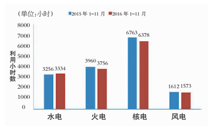 2015年、2016年1~11月各類型電源發(fā)電利用小時數(shù)對比