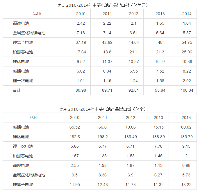 由表3還可以看出,鋰離子電池已經(jīng)成為所有電池類型中出口創(chuàng)匯最多的產(chǎn)品,2014年出口創(chuàng)匯達(dá)到54億美元,高于鉛酸的29億多美元和傳統(tǒng)原電池(鋅錳+堿錳+鋰一次電池)總和的約21億美元。