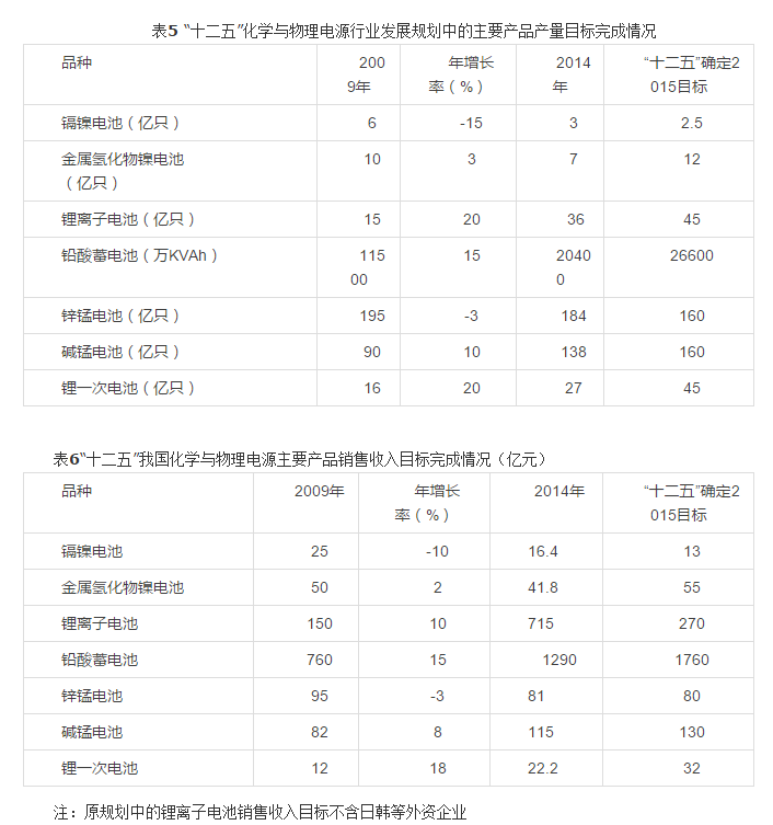 表1至表4列出我國(guó)化學(xué)與物理電源行業(yè)主要產(chǎn)品自2010-2014間的產(chǎn)量、銷售額以及出口數(shù)據(jù)統(tǒng)計(jì)。表5和表6則比較了2014年與2009年同類數(shù)據(jù)的比較,并對(duì)照了“十二五”行業(yè)發(fā)展規(guī)劃規(guī)定的相應(yīng)目標(biāo)。