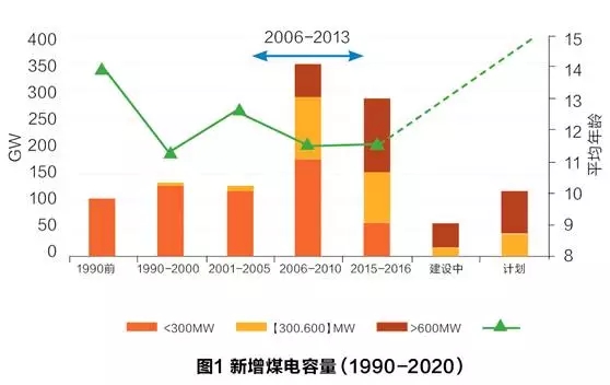 可以預(yù)見(jiàn),在市場(chǎng)環(huán)境下,這些大機(jī)組將是“虧錢(qián)”(missing-money)的那部分機(jī)組,生不逢時(shí),屬于不折不扣的“落后產(chǎn)能”。那么,這部分產(chǎn)能有多大呢?卓爾德Draworld研究中心對(duì)過(guò)去與今后5年預(yù)期的煤電增長(zhǎng),根據(jù)容量大小做了可視化的工作(圖1)。從2006年算起,到2016年的這十年,超過(guò)60萬(wàn)千瓦的新建超臨界機(jī)組超過(guò)1.5億以上。整體煤電機(jī)組的平均年齡11-12歲。