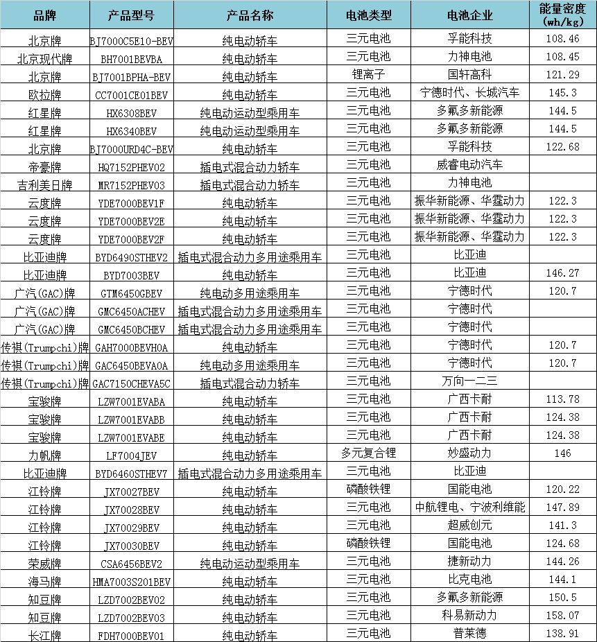 在入圍的34款新能源乘用車車型中,純電動車型有27款,以微型車和緊湊型為主,插電式混動車型有7款,以SUV為主。其中,搭載三元電池的車型有31款,磷酸鐵鋰電池車型2款,還有一款未注明電池類型。