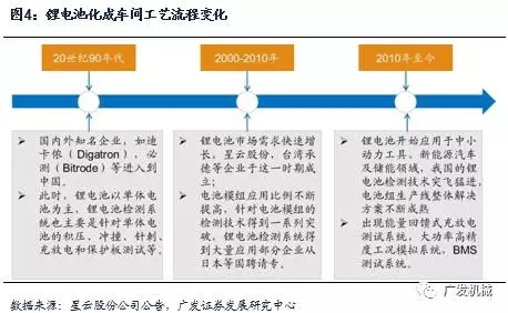 早在1980年代傳統(tǒng)的鋰電池檢測硬件系統(tǒng)就已經(jīng)面世,之后軟件系統(tǒng)成為傳統(tǒng)鋰電池檢測系統(tǒng)的重要補(bǔ)充,促進(jìn)了鋰電池檢測系統(tǒng)行業(yè)的發(fā)展。90年代隨著鋰電池應(yīng)用范圍進(jìn)一步擴(kuò)大,檢測技術(shù)快速發(fā)展,激活二次電池的化成設(shè)備開始規(guī)?;霈F(xiàn)。2010年之后新能源汽車和儲能應(yīng)用產(chǎn)品在國際范圍快速發(fā)展,行業(yè)進(jìn)入高速發(fā)展期,鋰電池檢測系統(tǒng)行業(yè)涌現(xiàn)出工況模擬系統(tǒng)、能量回饋系統(tǒng)和大功率檢測系統(tǒng)、BMS檢測等新一代產(chǎn)品,行業(yè)向自動化、系統(tǒng)化方向邁進(jìn),并且由離線選擇性測試向在線必需性測試轉(zhuǎn)變,需求大幅提升。目前后端設(shè)備形成了圍繞電芯激活化成、分容檢測以及電池組測試工藝的一系列設(shè)備。