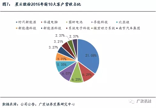 目前,星云股份已經(jīng)與國內(nèi)外各領(lǐng)域主要的鋰電池生產(chǎn)商建立長期合作關(guān)系,包括為時代新能源(CATL)、欣旺達(dá)、華通、微宏動力、新能德(NVT)、沃特瑪、索爾新能源、飛毛腿(SCUD)、捷新動力(ATBS)、比亞迪(BYD)、青島國軒、孚能、猛獅等企業(yè)提供鋰電池檢測系統(tǒng)及鋰電池組裝整體解決方案的服務(wù)。其中,國內(nèi)龍頭鋰電池生產(chǎn)商CATL是公司的長期合作伙伴,連續(xù)多年是公司第一大客戶,2015年、2016年營收貢獻(xiàn)2971.29、4777.83萬元,占比分別為21.04%,21.08%,同比增速達(dá)到60.79%,營收增速貢獻(xiàn)12.76%。