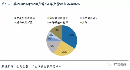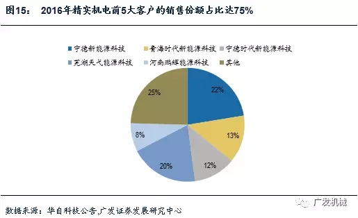 從客戶結(jié)構(gòu)來看,行業(yè)內(nèi)3家企業(yè)精實機(jī)電(華自科技擬收購)、泰坦新動力(先導(dǎo)智能收購)、瑞能股份2016年前5大客戶占比大都在70-85%(先導(dǎo)同期為59%),是鋰電生產(chǎn)中客戶集中度最高的環(huán)節(jié)之一。