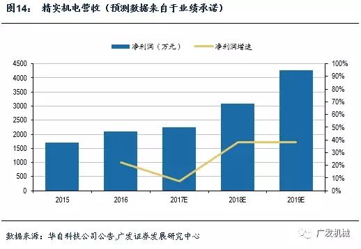 2015年、2016年和2017Q1公司扣除非歸母凈利潤分別為1,706.09萬元、2,058.54萬元和500.78萬元。主營業(yè)務(wù)收入分別為1.11億,1.22億和0.26億元,2016年上升10%,2017年公司的第一大客戶CATL的擴(kuò)產(chǎn)計劃共計8GWh,其中包括溧陽5GWh+寧德本部3GWh,測算得到檢測設(shè)備的投資需求為6.24億元。在業(yè)績承諾中,公司2017年營收預(yù)計達(dá)到1.79億,同比增長45.83%。在公司收購方案公告中,公司預(yù)計精實機(jī)電2017-19年毛利率分別為35.55%、37.41和37.19%。
