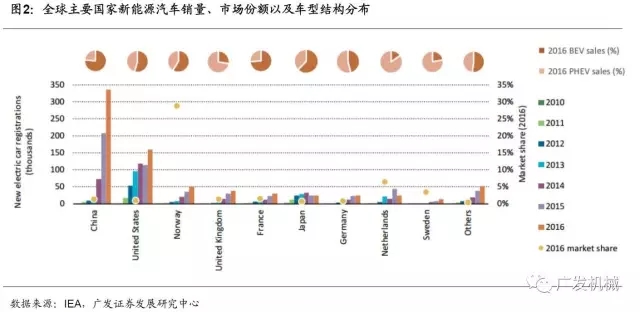 2016年全球新能源汽車銷量創(chuàng)歷史高點(diǎn),總計超過75萬輛。其中,中國市場的增長尤為明顯,新增數(shù)量高達(dá)33.6萬輛,約為同期美國新能源汽車新增保有量的2倍。歐洲市場新能源汽車2016年新增保有量約為21.5萬輛,新能源汽車的發(fā)展還是集中在以下部分國家,主要包括挪威、英國、法國、德國、荷蘭及瑞典。挪威對新能源汽車的發(fā)展在政策上給予了大力支持,新能源汽車的稅收、道路通行費(fèi)等都有較大程度的減免,使得挪威成為2016年新增汽車數(shù)量中新能源汽車占比最大的國家,占比高達(dá)29%。此外,中國和法國的新能源汽車市場中,純電動汽車的占比極大,約為75%。而荷蘭、瑞典及英國以發(fā)展插電式混合動力汽車為主。