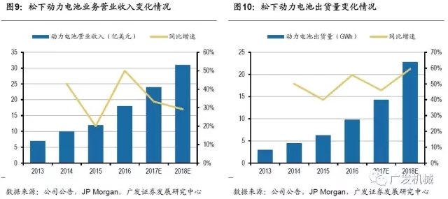 松下電器產(chǎn)業(yè)株式會社創(chuàng)建于1918年,于1994年開始研發(fā)可充電鋰離子電池。1998年松下開始量產(chǎn)筆記本電腦專用的圓柱形鋰離子電池,并建成了業(yè)內(nèi)領(lǐng)先的鋰離子電池生產(chǎn)線。2008年11月,松下宣布與三洋電機(jī)合并,一躍成為全球最大的鋰電池供應(yīng)商。隨著新能源汽車的興起,松下動力電池業(yè)務(wù)營業(yè)收入快速增長,2016年達(dá)18億美元,同比增速約為50%,2016年動力電池出貨量約為9.8GWh,同比增速56%。