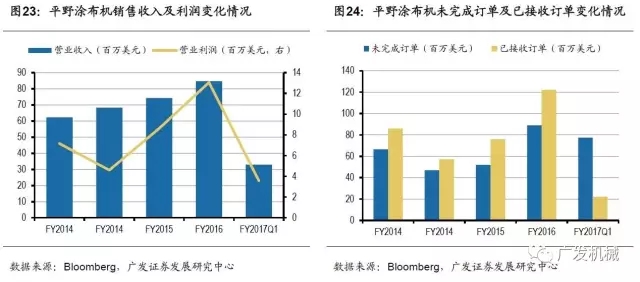 近年來,受益動力電池行業(yè)景氣度高漲,平野涂布機(jī)業(yè)務(wù)營業(yè)收入逐年攀升,F(xiàn)Y2017年涂布機(jī)營業(yè)收入8470萬美元,同比增長14%,營業(yè)利潤1306萬美元,同比增長51.4%。此外,動力電池企業(yè)持續(xù)擴(kuò)產(chǎn),平野涂布機(jī)在手訂單充裕。