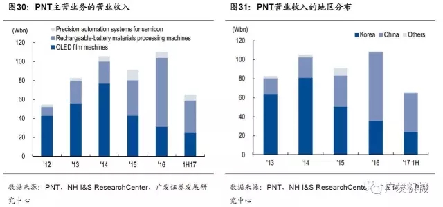 韓國以及全球新能源汽車的發(fā)展帶動了韓國三星SDI、LG化學(xué)等動力電池企業(yè)的繁榮,作為三星SDI、LG化學(xué)等優(yōu)質(zhì)動力電池企業(yè)鋰電設(shè)備的供貨商,PNT鋰電設(shè)備業(yè)務(wù)營業(yè)收入快速增長。從PNT營業(yè)收入的地區(qū)分布來看,中國市場對業(yè)績的貢獻(xiàn)逐年增大,并在2016年首次超過韓國本土。受益新能源汽車中國市場的發(fā)展,2017年上半年,PNT中國市場的營收占比進(jìn)一步擴(kuò)大,達(dá)到了61.9%,
