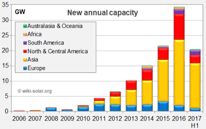 中國儲(chǔ)能網(wǎng)訊:Wiki-Solar(維基百科-太陽能)發(fā)布的半年度數(shù)據(jù)顯示,公用事業(yè)規(guī)模太陽能容量部署繼續(xù)加速。今年上半年雖然僅20吉瓦公用事業(yè)規(guī)模太陽能并網(wǎng),但累計(jì)容量已超越2017年初不可思議的100吉瓦,達(dá)120吉瓦。