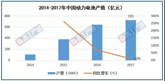 2017年中國動力電池產(chǎn)值725億元,同比增長12%。動力電池產(chǎn)值增速遠低于產(chǎn)量增速,主要因為2017年政策調(diào)整,補貼力度大幅下滑,主機廠將部分成本壓力轉(zhuǎn)嫁到動力電池企業(yè),使動力電池價格大幅下滑。