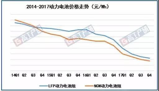 GGII數(shù)據(jù)顯示,2017年年底動力電池價格較2017年初下滑20%~25%。磷酸鐵鋰電池組價格從年初的1.8~1.9元/Wh下降到年底的1.45~1.55元/Wh。三元動力電池包價格從年初的1.7~1.8元/Wh下降到年底的1.4~1.5元/Wh。