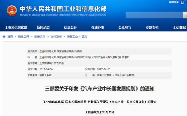 4月25日,國家工信部、國家發(fā)展和改革委以及科技部聯(lián)合制定的《汽車產(chǎn)業(yè)中長期發(fā)展規(guī)劃》(以下簡稱《規(guī)劃》)在工信部網(wǎng)站公布,《規(guī)劃》描繪了我國汽車產(chǎn)業(yè)尤其是新能源汽車產(chǎn)業(yè)的發(fā)展藍(lán)圖,計(jì)劃用十年時(shí)間,完成從汽車大國向汽車強(qiáng)國的蛻變。
