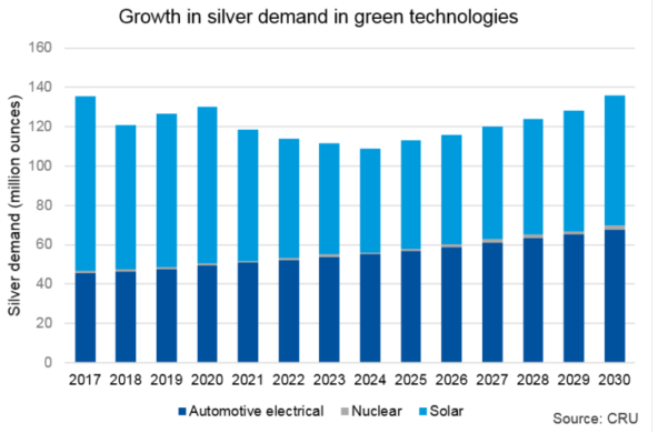 因此,CRU專(zhuān)家預(yù)測(cè),在20世紀(jì)20年代中期,光伏產(chǎn)業(yè)的白銀需求量將從現(xiàn)在每年約7,000萬(wàn)~8000萬(wàn)盎司,下降至5000-5500萬(wàn)盎司,再到2030年,白銀需求恢復(fù)至每年約為6600萬(wàn)盎司。