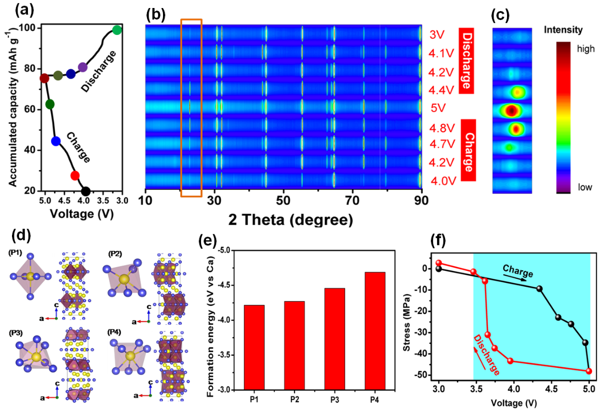 圖1.(a)錫金屬負(fù)極在鈣離子電解液中的首次充放電曲線;(b,c)XRD分析表明,在充電過(guò)程中鈣離子和錫負(fù)極發(fā)生合金化反應(yīng)生成Ca7Sn6合金,在放電時(shí)Ca7Sn6發(fā)生去合金化反應(yīng);(d,e)鈣離子和錫在Ca7Sn6合金相中的四種成鍵情形及其對(duì)應(yīng)的結(jié)合能;(f)錫負(fù)極首次充放電過(guò)程的原位電化學(xué)應(yīng)力測(cè)試曲線。