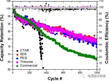 Kyung等用電鍍法制備了添加不同表面活性劑的鋅負(fù)極。X射線衍射(XRD)和掃描電鏡的結(jié)果表明,不同的添加劑(CTAB,SDS,PEG-8000,thiourea)能夠顯著影響鋅的結(jié)晶結(jié)構(gòu)和表面紋理。當(dāng)鋅具有強(qiáng)的(100)(110)衍射峰時(shí),枝晶更嚴(yán)重。而密集的表面紋路能夠有效抑制腐蝕,并顯著提升電池的浮充性能。17如圖9,經(jīng)過(guò)1000圈循環(huán),Zn-硫脲(thiourea)負(fù)極有著更高的容量保持率(80%),并且顯著優(yōu)于空白鋅負(fù)極(67%)。